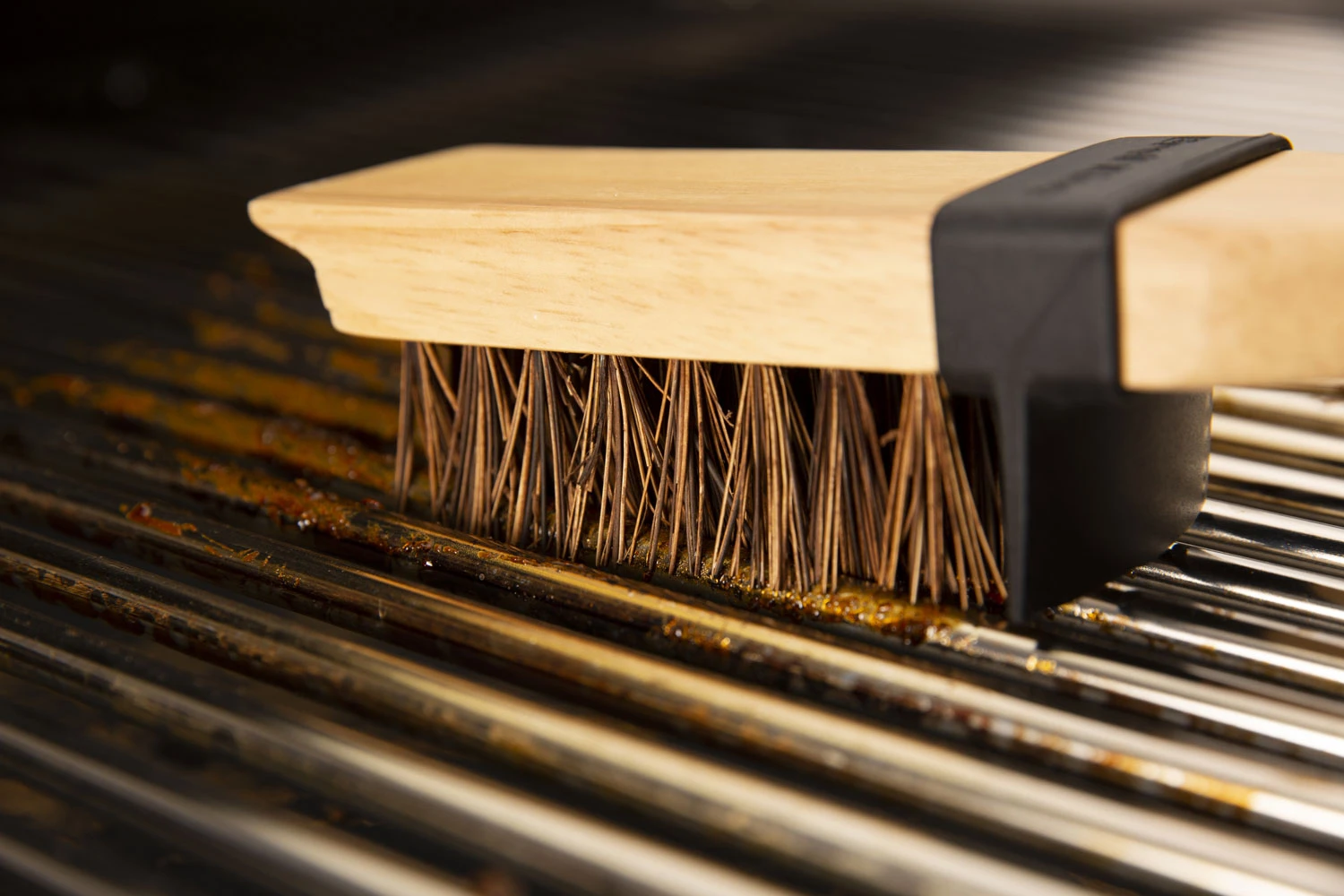 Die perfekte Alternative zu klassischen Edelstahlbürsten oder Messingbürsten: Die Holzgrillbürste mit extra langen Palmyraborsten von Broil King.