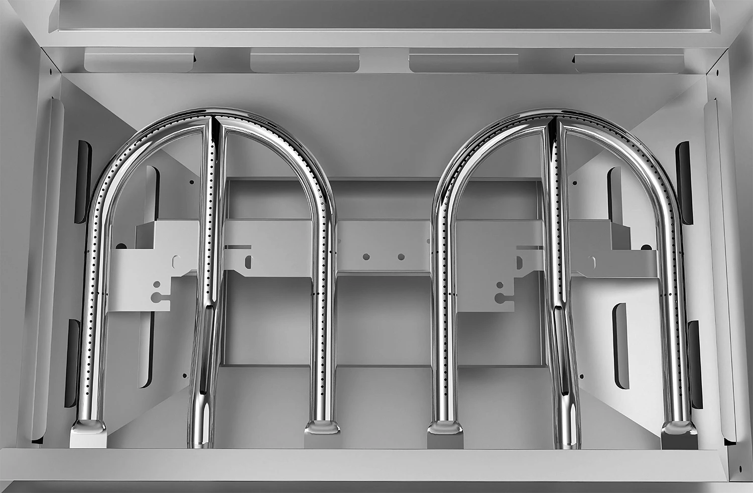 - 2 separat regulierbare, U-förmige Brenner aus Edelstahl mit 6,4 kW Leitung & elektrischer Zündung – Temperaturen bis zu 280 °C