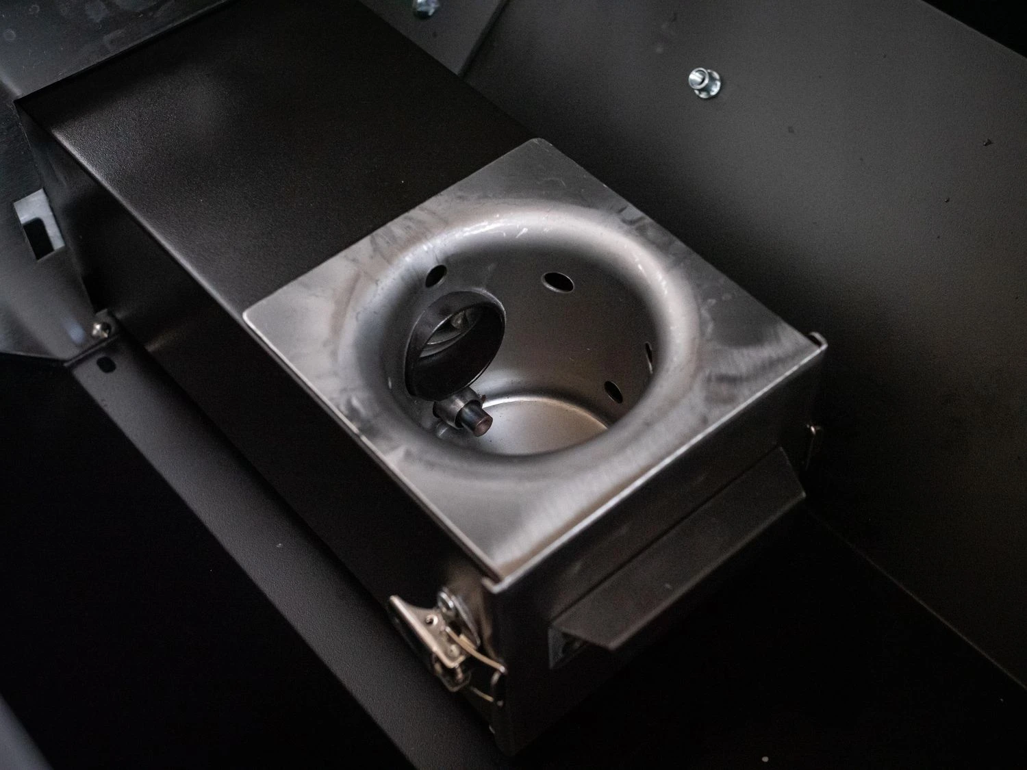 Danach den Brenntopf, welcher gleichzeitig auch die Ascheschale ist, entnehmen. Dazu die beiden Arretierungen lösen und einfach am Griff herausziehen. Übrig gebliebene Pellets und Aschereste einfach entleeren. Zuletzt muss lediglich der Fettauffangeimer im Unterschrank des Pelletgrills entleert werden.