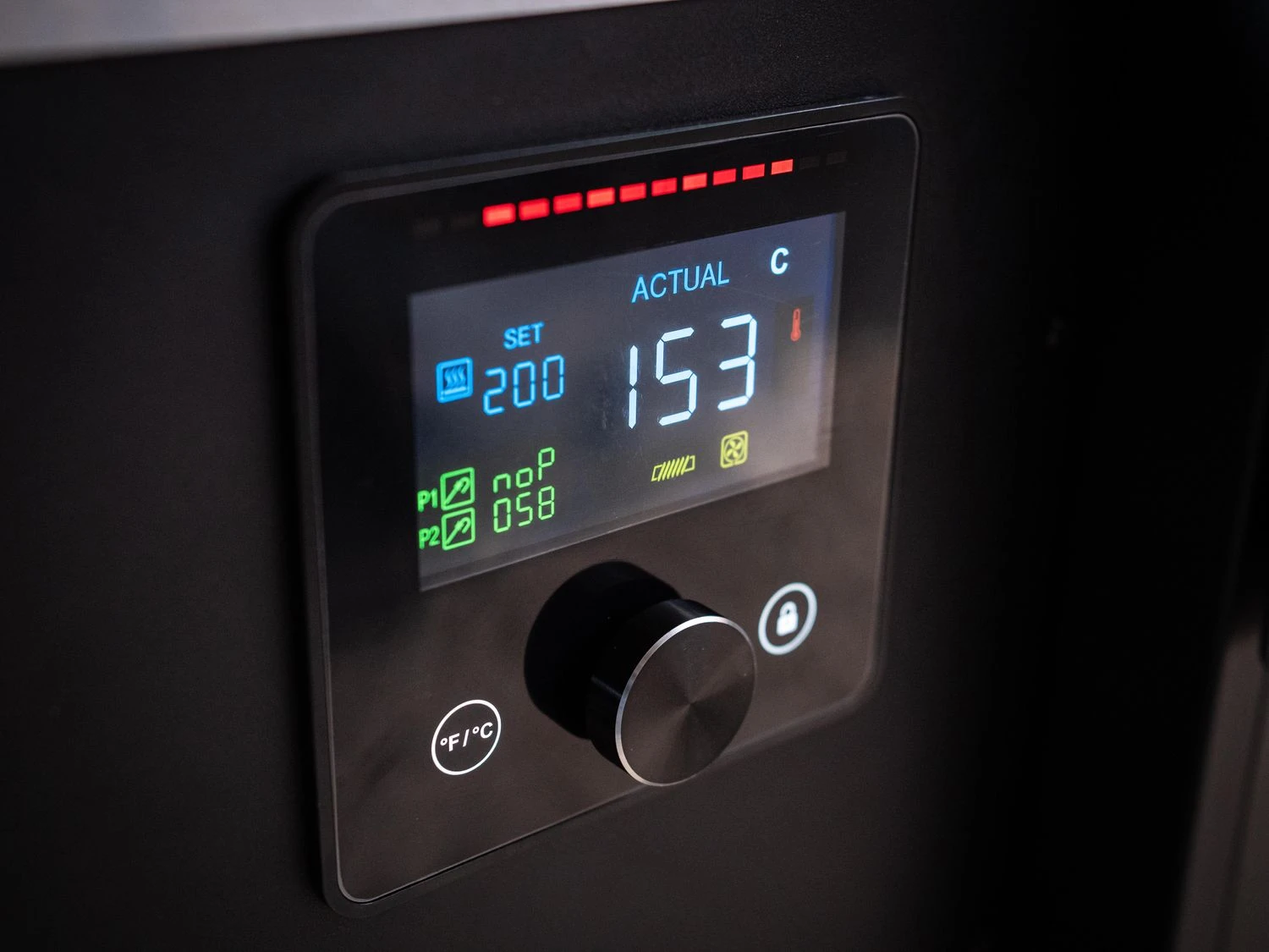 Der digitale Controller bietet jede Menge geniale Steuer- und Überwachungsfunktionen. Nach dem Einschalten des Pelletgrills wird hier zunächst die gewünschte Temperatur eingestellt, auf welche der Pelletgrill aufheizen soll. Dazu mit dem Steuerrad die Garraumtemperatur von 90°C bis 270°C in 5°C – Schritten einstellen und bestätigen. Eine Temperaturanzeige stellt mit Hilfe von leuchtenden LEDs, zusätzlich zum Display, dar, welche Temperatur gerade im Garraum herrscht.