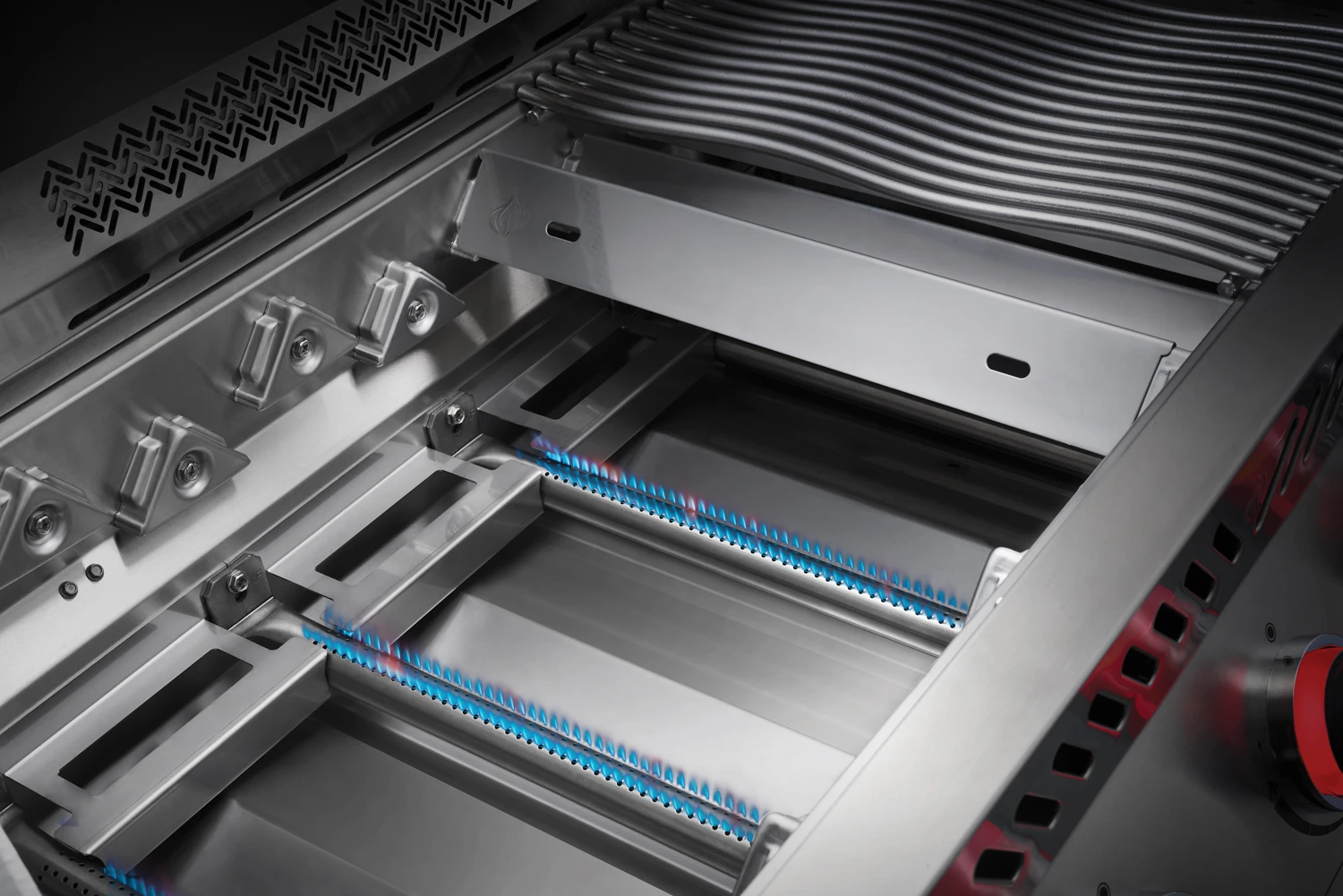 - Safety Glow™ Bedienelemente (Einbaugrill + Sizzle Zone) – zeigt an, ob Gaszufuhr offen oder geschlossen ist