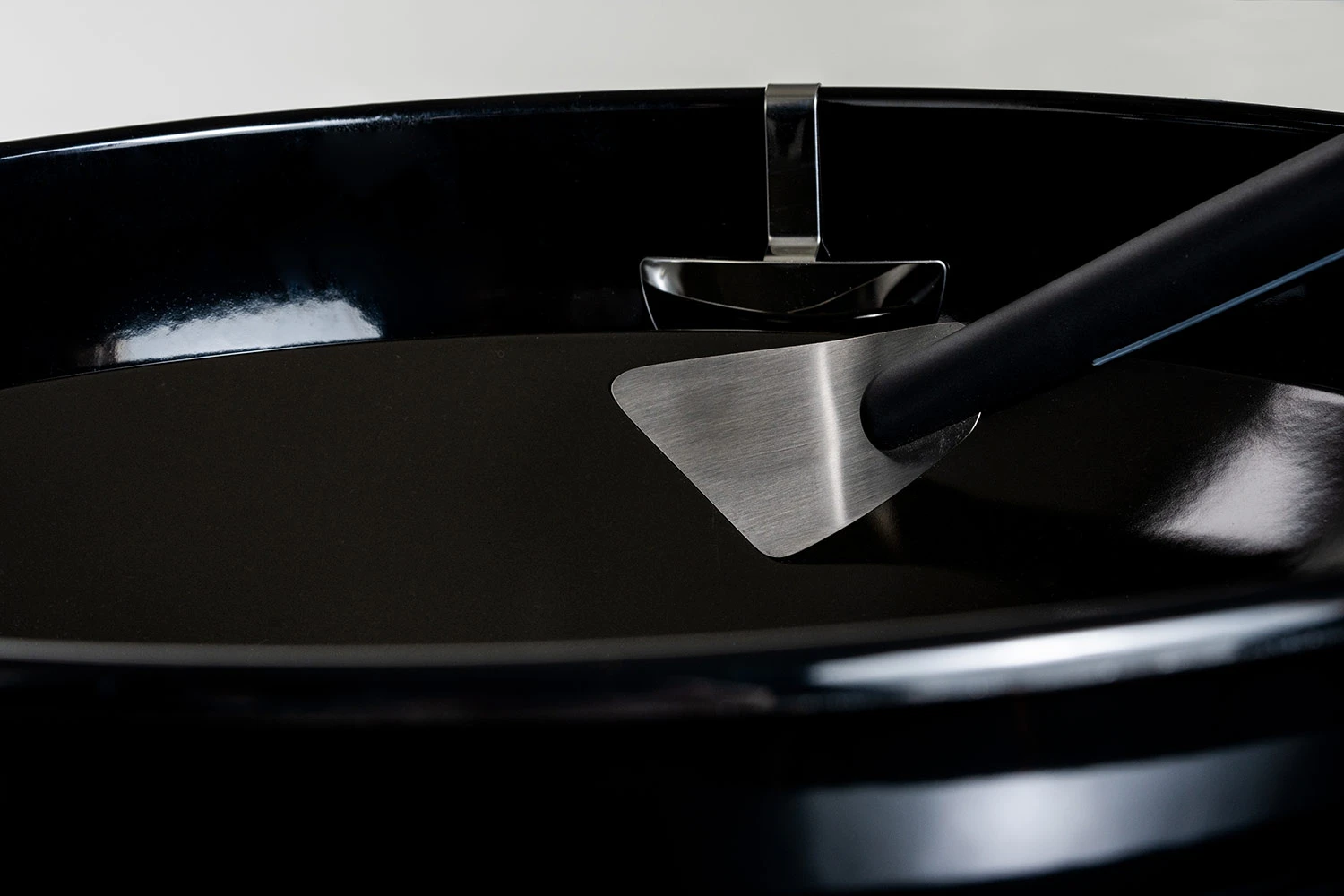 Für ein angenehmes Handling ist der Schaber mit einem stabilen, abgerundeten Kunststoffgriff ausgestattet. Mithilfe der praktischen Öse zum Aufhängen lässt er sich platzsparend und stets griffbereit an den Besteckhaken am Grill aufhängen.