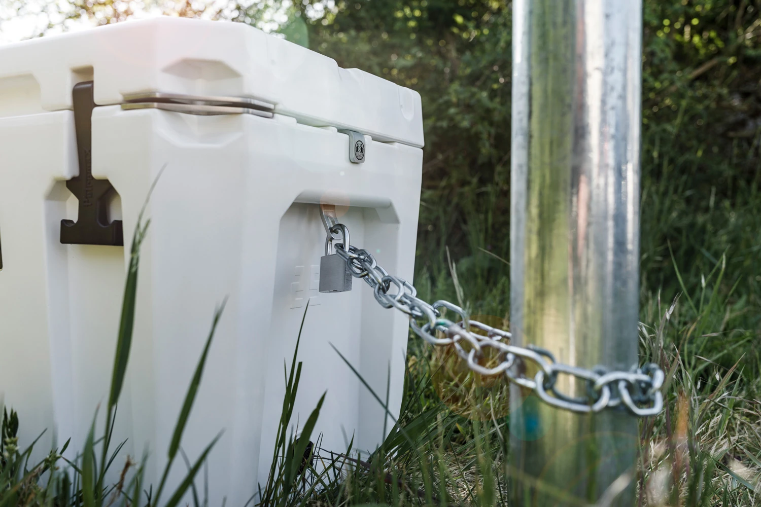 Die Schlosshalterung wird einfach von oben in den seitlichen Griff der Kühlbox gesteckt und beim Verschließen der Box automatisch arretiert. So kann sie nicht mehr entfernt werden. Mit einer Kette und einem Schloss kann die Kühlbox dann vor Diebstahl gesichert werden.