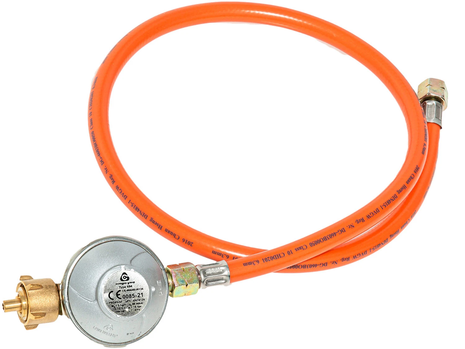 Druckregler mit integrierter Schlauchbruchsicherung und Anschlussschlauch für die Rösle Videro Gasgrills, aber auch für viele andere 50 mbar Geräte – auch von anderen Herstellern.