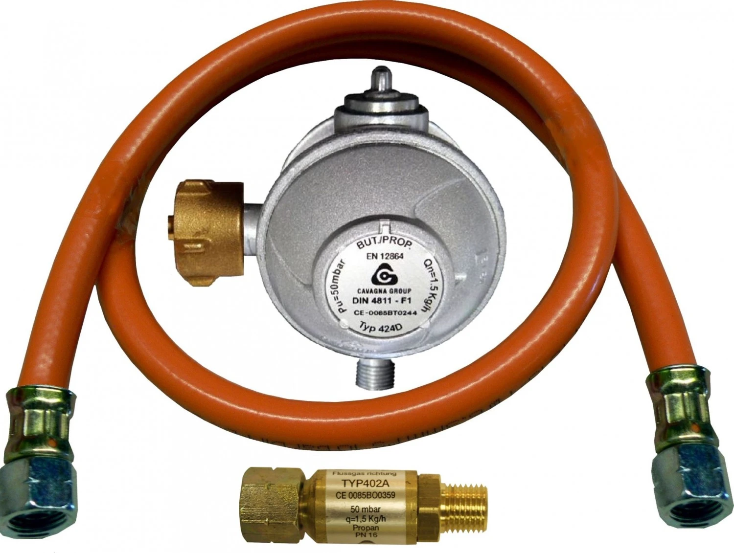 1 Sicherheits-Druckminderer (GW-Regler) mit 90° Abgang, 1 Schlauchbruchsicherung und 1 Gasschlauch – 80cm lang